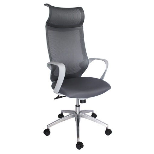 Sillón Ejecutivo base: estrella de 5 puntas en aluminio fundido y pulido, rodajas tipo dual y/o regatones. Elevación: por medio de pistón neumático que permite ajustar la altura del asiento Mecanismo: plato de acero reforzado con sistema de reclinación y palanca de bloqueo, perilla de regulación de tensión para el sistema de reclinación. Brazos: de polipropileno semi-rígido. Respaldo: alto en malla de diseño ergonómico con cabecera. Asiento: hule espuma laminado flexible con densidad de 60 kgs/m3 con retardante a la flama y alta resilencia. Tapiz: respaldo en malla de color gris y asiento en tela o vinil al color de su elección de nuestro catálogo. Peso máximo de resistencia: 120 kgs. Disponible también en versión sin cabecera y visitante base trineo