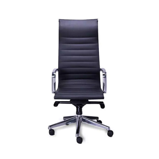 Sillón de la familia retro, con respaldo alto. Cuenta con mecanismo de reclinamiento de rodilla con 4 posiciones de bloqueo regulado a través de perilla de tensión. Su asiento y respaldo en una sola pieza con diseño ergonómico tapizado en poliuretano. Descansabrazos fijos que forman parte de la monocarcasa y base de 5 puntas elaborada en aluminio pulido.