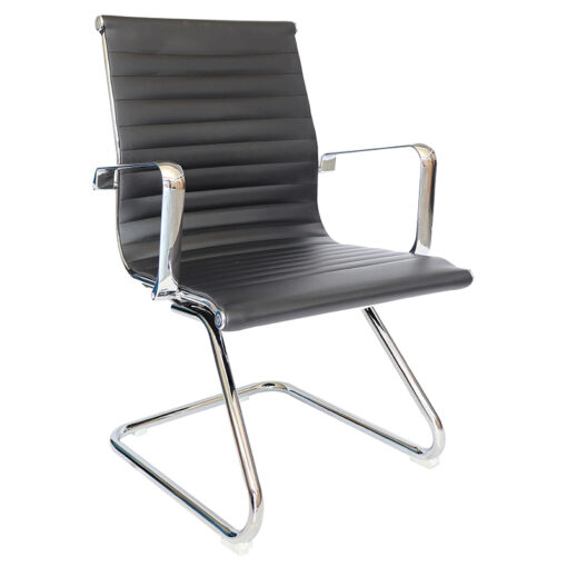 Sillón Ejecutivo Visitante Base: trineo de acero tubular redondo de 1″ de diámetro, calibre 14; con terminado en cromo. Asiento y respaldo: bajo de un sólo corte tensado con la estructura para dar una suspensión única y adaptarse al cuerpo tapizado en soft revolving leather acojinado con hule espuma laminada flexible; toda la estructura es de acero tubular con terminado en cromo. Brazos: de aluminio fundido y pulidos con terminado en cromo. Color: negro. Peso máximo de resistencia: 160 kgs.