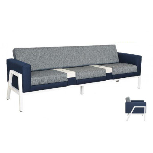 Sofá de 3 Plazas con estructura en madera de pino solida de 21 mm. de primera calidad, estructura ligada con bandastic, rafia entretejida al resorte y bastidor para mayor firmeza. Base tubular cuadrado de 1¼”, terminado en pintura epoxica, en colores negro, blanco, aluminio y oxford. Respaldo y asiento tapizados en variedad de colores (consultar catalogo tapices). Acojinamiento hule espuma en asiento y respaldo de 8 cm. de espesor, d.20 kgs/m³.