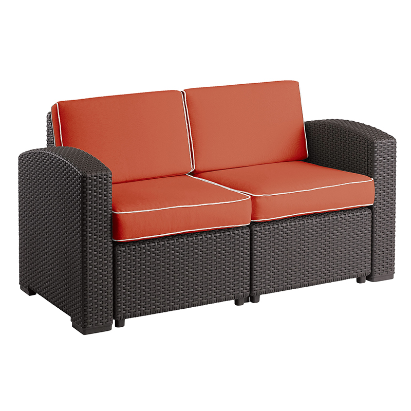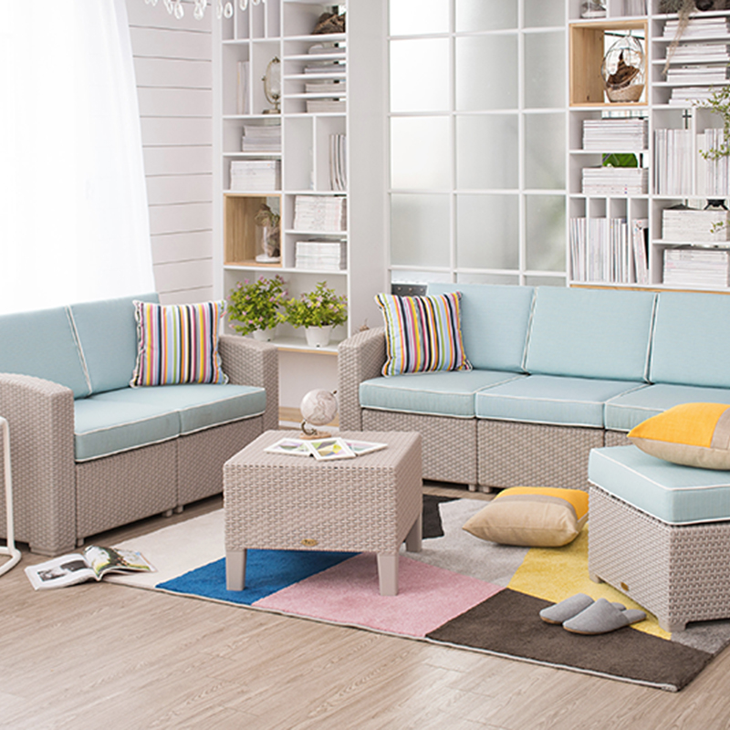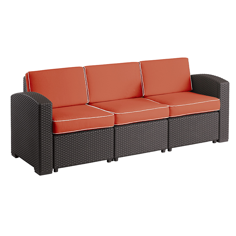 Sofá para exteriores mueble: en polipropileno de alta resistencia y duración para intemperie e interior, resistente a los rayos ultravioleta (UV) y al ambiente salino con terminado en imitación rattán. asiento y respaldo: acojinado con hule espuma laminado flexible con densidad en 27 kgs/m3 y alta resilencia. peso máximo de resistencia: 180 kgs. Disponible en varias versiones y accesorios adicionales.