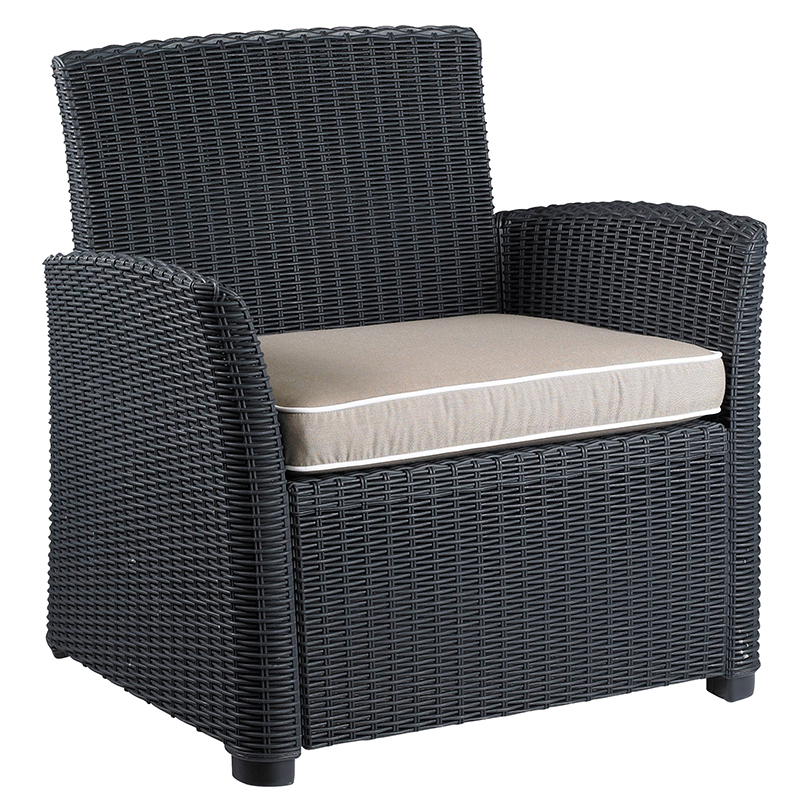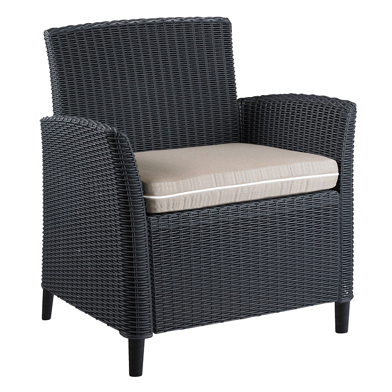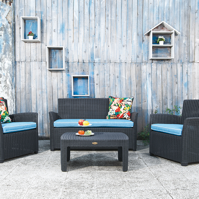 Sofá para exteriores mueble: en polipropileno de alta resistencia y duración para intemperie e interior, resistente a los rayos ultravioleta (UV) y al ambiente salino con terminado en imitación rattán. Asiento: acojinado con hule espuma laminado flexible con densidad en 27 kgs/m3 y alta resilencia. Peso máximo de resistencia: 180 kgs. Disponible en varias versiones y accesorios adicionales.