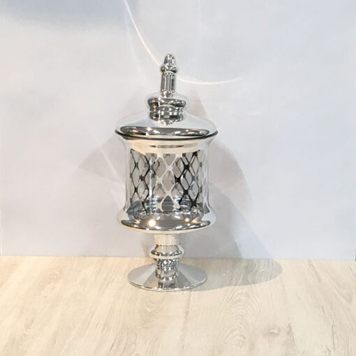 Tibor de vidrio con tapa acabado espejo reflejante de luz, ideal para complementar la decoración de tu oficina o casa
